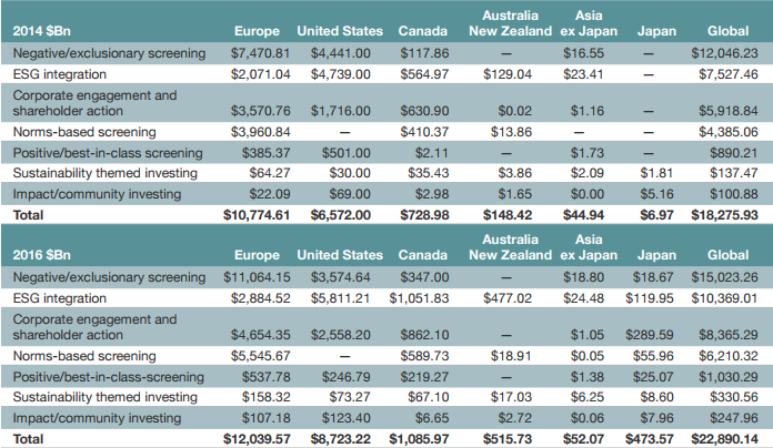 Europe – SRI grew to $12 trillion in 2016, up by 12% from $10.8 trillion in 2014, now representing 53% of surveyed investment AUM. Exclusionary screening and norms-based screening remain the dominant SRI strategies, and their use grew by 48% and 40% respectively, affecting up to $11 trillion in assets.